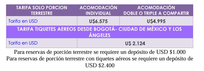 Propina obligatoria de servicio 80 USD por persona se entregan el primer día de llegada.